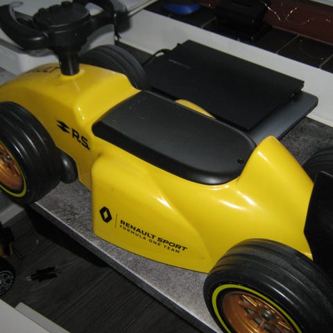 Vaaleanpunainen metallinen potkuauto. Täysin toimiva. Rattia kääntäessä vinkuu, mutta varmasti rasvaamalla hiljaiseksi. Yksi täplätarra lähtenyt irti ja yksi vähän repsottaa, muuten en moitteita löydä. Kaikki renkaat pyörii ja ratti kääntää etupyöriä.