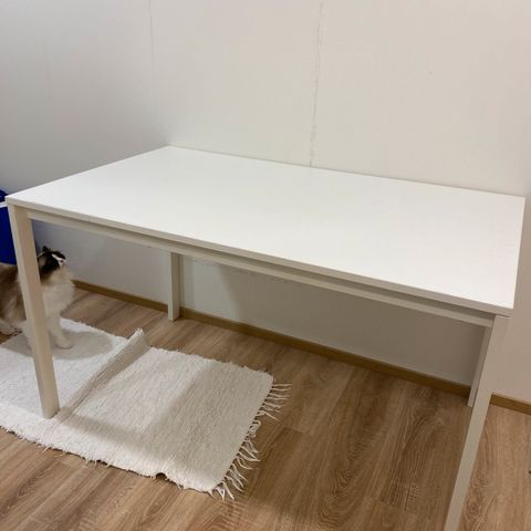 Valkoisella ikilevy pinnalla oleva ovaali/ellipsi ruokapöytä + jalka.