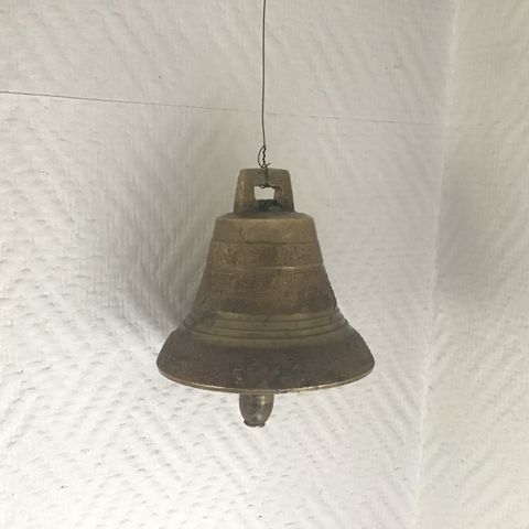 Valamon heleä-ääninen soittokello säilytyspussukoineen. Kellon korkeus 5 cm.