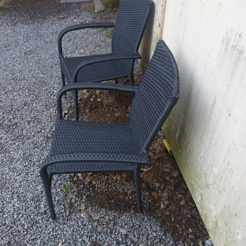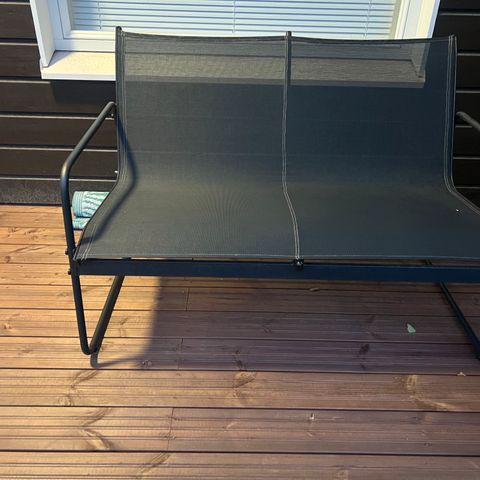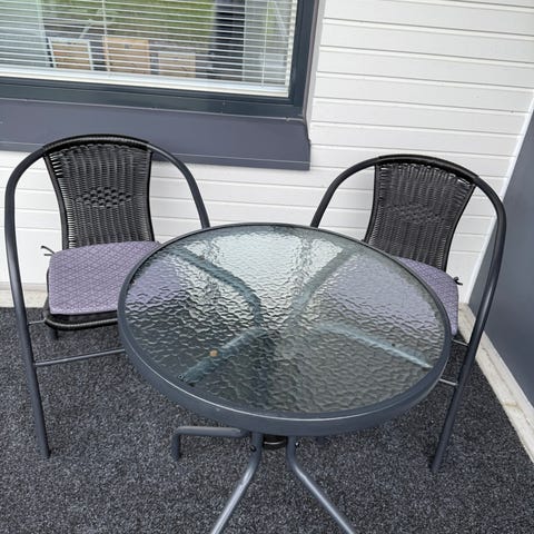 Puuinen kokoontaittuva parvekesetti, joka sisältää pöydän ja kaksi tuolia. Tuolien pehmusteet saa mukaan.