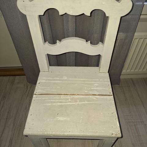 Valkea puinen vanha tuoli tummanharmaalla istuinpehmusteella