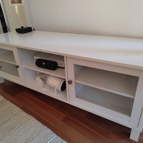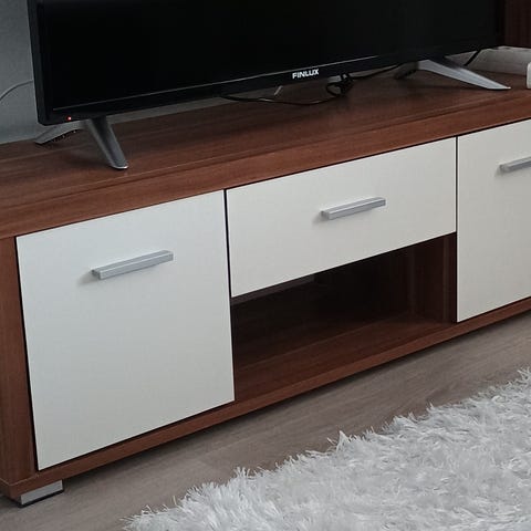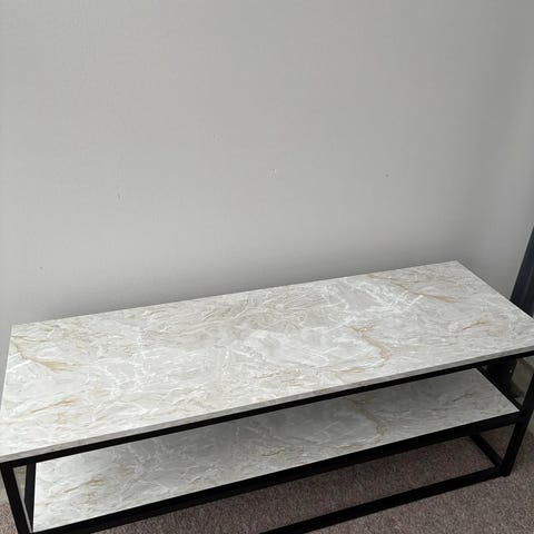 Toimistolla vähäisessä käytössä ollut musta metallinen mutta kevyt TV-taso. Tuli tarpeettomaksi muuton mukana.