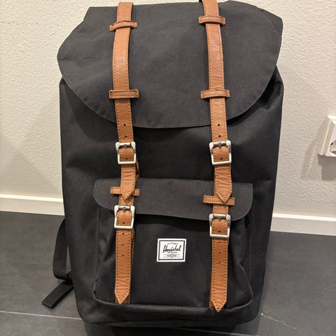 Kaksi kertaa käytetty Herschelin Little America -reppu. Väri oliivinruskea.