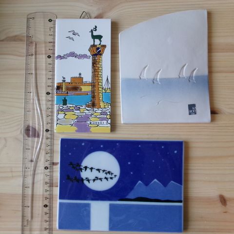 Kukka-aiheiset kaakelitaulut 2 kpl 90-luvulta ja 1 70-luvulta. Kehystetyt 17 x 17 cm. Kehystämätön 15 x 15 cm. Kaikki yht. 5 euroa