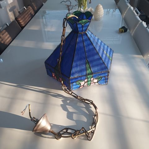 Myydään näyttävä Tiffany-tyylinen lyijylasinen riippuvalaisin. Kauniit värilliset lasipalat ja koristeellinen kupolimalli luovat lämpimän ja tunnelmallisen valon. Tukeva rakenne ja ketjukiinnitys.