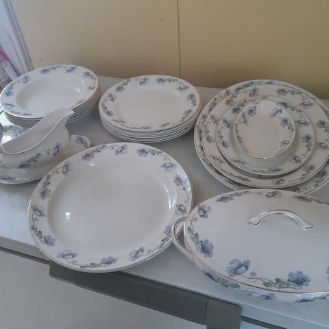 Isoja lautasia 9kpl, salaattilautanen 9kpl, leipälautanen 3kpl, jälkiruokalautanen 2kpl ja kastikekulho kauhalla. Kastikekulhossa pieniä lohkeamia reunassa. Lisäksi mukaan saa 3 isoa ja 1 leipälautasen jossa reunassa lohkeamia.