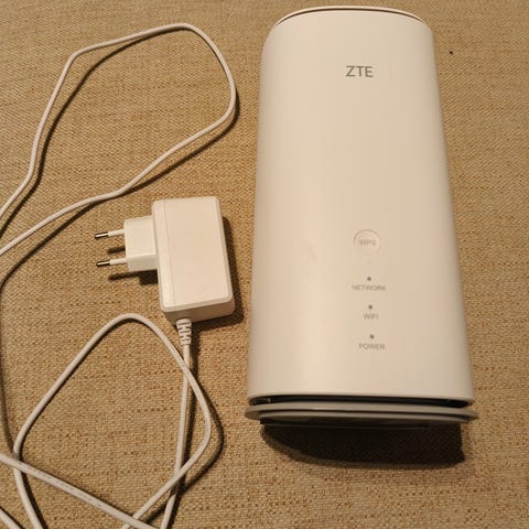 ZTE 5G-reititin valkoisella värillä. Laite tarjoaa langattoman verkkoyhteyden 5G-verkoissa. Sopii kotikäyttöön tai pienille toimistoille, joissa tarvitaan nopeaa internetyhteyttä.