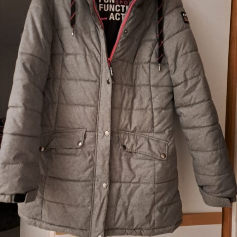 Hyväkuntoinen, vähän pidetty takki. Hupun saa irti.