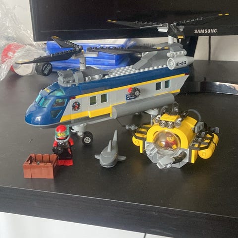 Myydään LEGO City 60093 Syvän Meren Helikopteri. Setistä puuttuu pari palaa, ei vaikuta rakentamiseen. Nokkaosa on hieman vääntynyt (näkyy kuvassa). Ohjeet ladattavissa netistä Legon sivuilta. Puutteet huomioitu hinnassa.