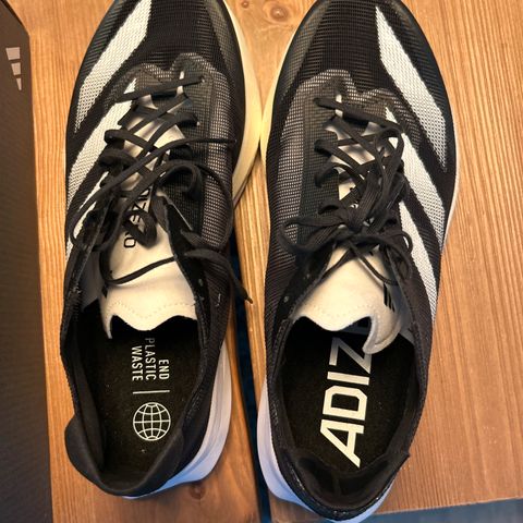 Adidas Adizero juoksukengät, koko 42. Kengät on suunniteltu juoksuun ja niissä on vaalean keltainen ja punainen väritys.