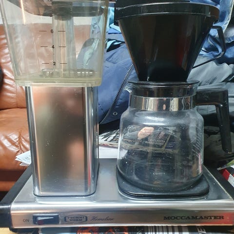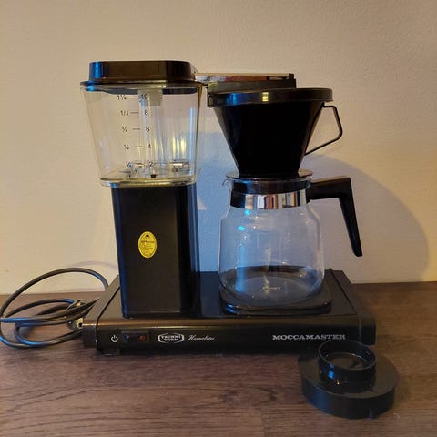 Moitteettomasti toimiva Moccamaster, josta pudonnut levyn lämmittämisen katkaisija (mutta kuka nyt haluaa kahvinsa painuttaa pilalle) ja suodattimen kannen reunassa lohkeama. Hinta sen mukainen.