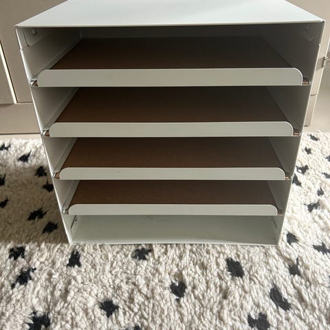 Paperilokerikko 5 hyllyllä. Jämäkkä, suht siisti. ’Kantokahva’ päällä.