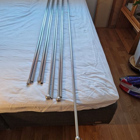 Musta verhotanko jonka pituutta voi säätää. Kuvassa maksimipituus. Mukaan 27kpl renkaita ja kolme pidikettä