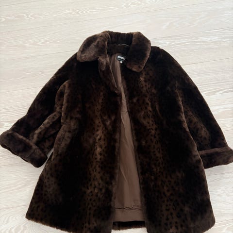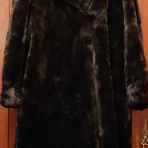 Hyväkuntoinen, tumman ruskea "turkki" sileää tekoturkista, 100 % polyesteriä, Jennifer Collection. A-mallinen. Pehmeä ja mukava päällä. Sivutaskut. "Koukkukiinnitys".