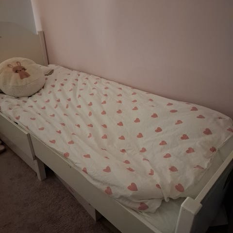 Kauniit lasten rautasängyt messinkikoristeilla. Hyvässä kunnossa, maalattu aikoinaan pulverilla.