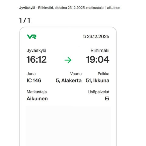 Junaliput opiskelijalle Jyväskylä-Helsinki-Jyväskylä