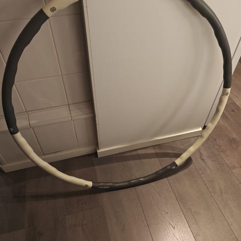 Gymstick hula hoop -harjoitusväline harmaassa ja valkoisessa värissä. Väline on suunniteltu kehon liikkuvuuden ja lihaskunnon harjoittamiseen.