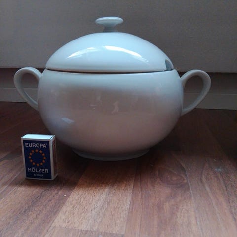 Keittokupppi, aluslautanen ja lusikka, sinivalkoinen keramiikka