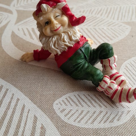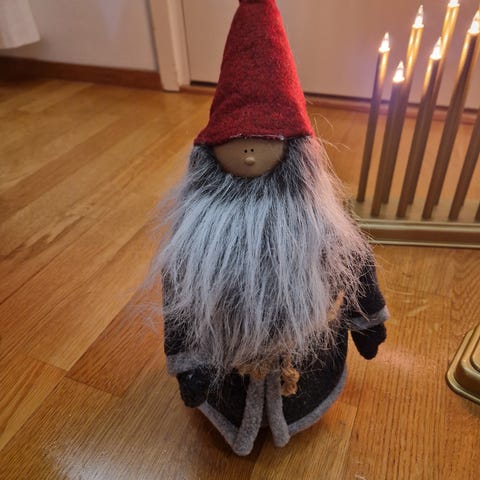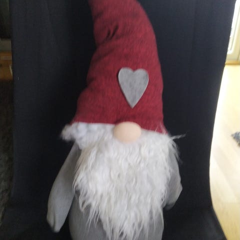 Tonttu / koristetonttu, kokonaiskorkeus 75 cm. Seisoo omilla jaloillaan, hiukan takakenoisesti. Voi varmaan säätää hiukan. Meillä ei ole ollut käytössä, vain säilössä.