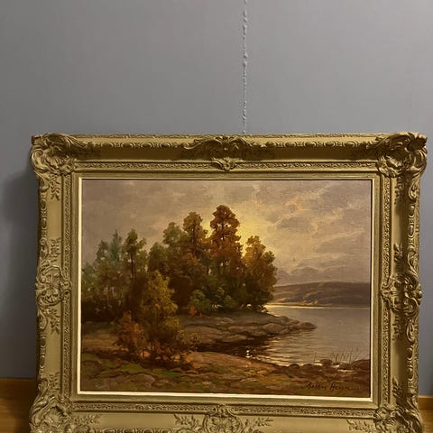 Heickelin tyypillinen romanttinen öljyvärimaisema 57x77 puukehyksin, vuosiluvusta ei tietoa mutta hankittu isovanhempien seinälle 90-luvun alussa. Kehyksen vasemmassa alakulmassa tarkkaan katsottuna liitos kuivunut väljemmäksi kuin muut kulmat. Muuten maalaus hyväkuntoinen signeerauksineen.Hp 160€