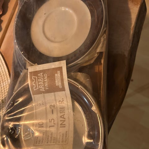 Siistikuntoinen setti Inari-malliston lautasia. Konepesun kestäviä.