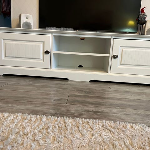 TV-taso, jossa on vaaleaa puukuvioista pintaa ja valkoiset ovet. Sisältää avohyllyt ja kaappi-tilaa. Siisti ja ehjä, ollut käytössä hyvin vähän aikaa.