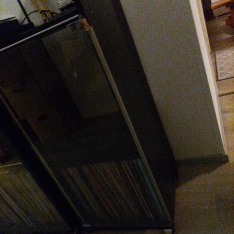 Levysoitin/laitekaappi lasiovilla ja kannella. Sisä"verhoilu" irtoollut eri kohdista (ka. kuvat)