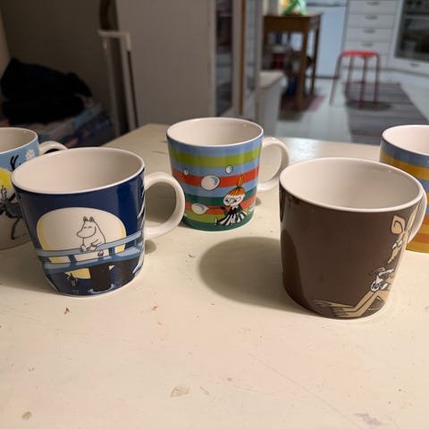Kuvan muumimukit (Nipsu ja Ruusutarha) yhteishintaan 500 euroa.