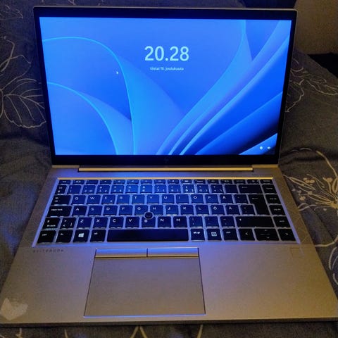 Kone ottanut pienen kolhun, ja kannen reunasta puuttuu pieni pala muovia ja aluminiinisessa nurkassa on jälki. Muuten siistissä kunnossa, näyttö on täysin ehjä.