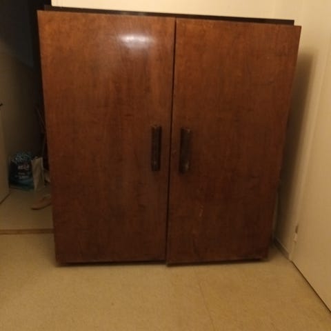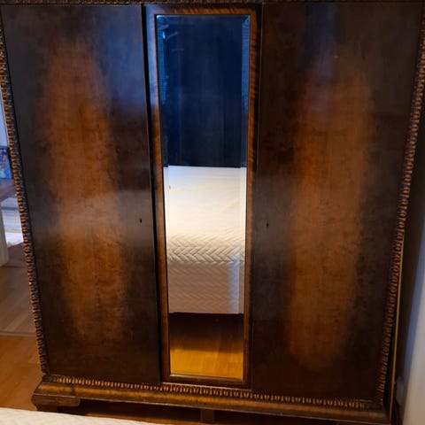 Tässä vanha harvinaisuus vaatekaappina. Täyspuuta kauniilla peiliovilla.