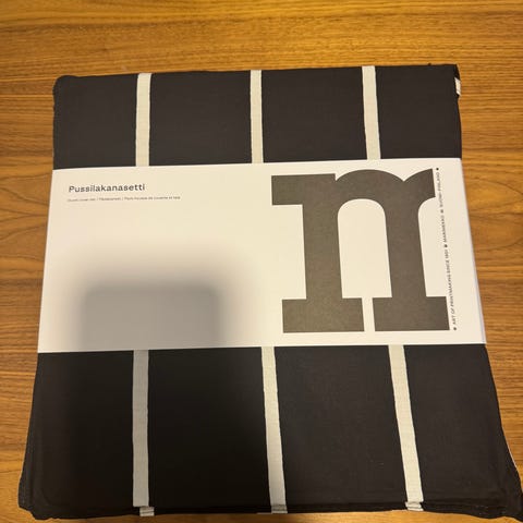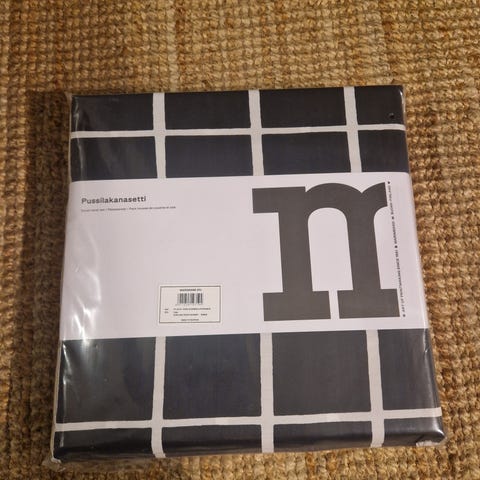 Myydään mustavalkoinen Marimekko tiiliskivi lakanasetti x2 + Marimekko kangaskassi. 2x 150*210 cm + 50*60cm