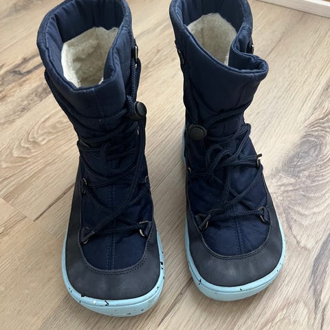 Yhden talven ja yhden lapsen käytössä olleet talvikengät. Kantapään takaa villavuoressa kulumaa ja nahkaosat jonkinverran haalistuneet. Käsitelty suojasuihkeella. Valmistajan ilmoittama sisämitta 20,9cm.