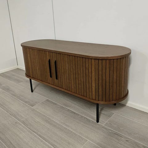 Upea ovaalinmuotoinen Nola-tv-taso tarjoaa tyylikkään ja toiminnallisen ratkaisun sisustukseen. Tammipaneelin, mustan metallin ja pyöristettyjen kulmien yhdistelmä luo tasapainoisen ja mielenkiintoisen ilmeen. Lisäksi tilaa säästävät liukuovet tarjoavat käytännöllisyyttä ja joustavuutta säilytysratkaisun käyttöön