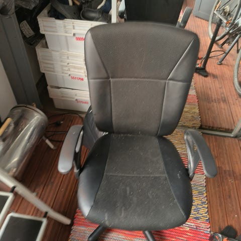 Käytön jälkiä on, mutta ihan mukava tuoli. Korkeus säädettävä, mutta nojauksen kulmaa ei pysty säätää, vaan on joustava.