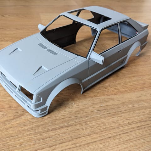 RC-auton kori 1/10 Fiat 131 valoilla, alustan pölysuojalla ja rengassarjalla
