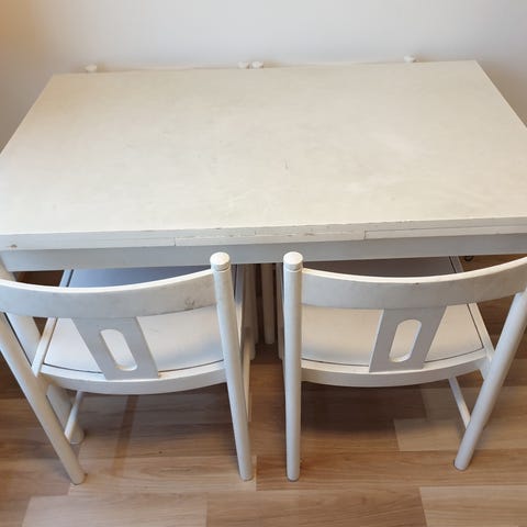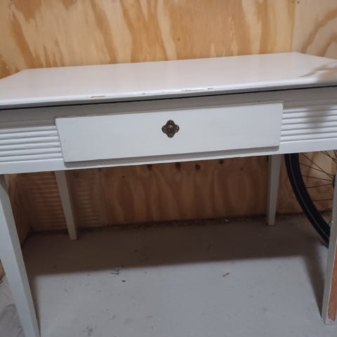 Vanha ompelukonepöytä. Sisällä ompelukone.