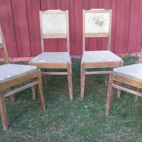 Täyttä koivua. Painavat tuolit ja pöytä. Pöydässä kaakeli pinnoite. Pieniä maalivaurioita tullut ylli 30 vuoden aikana. Valmistaja Asko tai Isku .Vain nouto. Oulu / Pyykösjärvi.