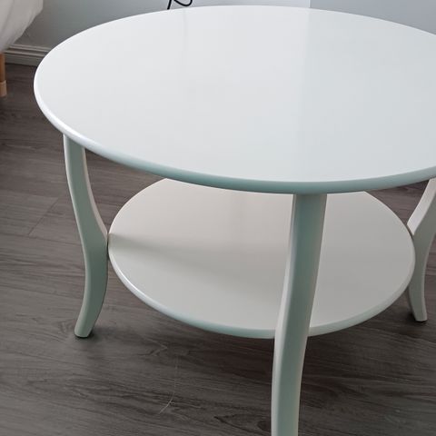 Pyöreä valkoinen sohvapöytä, jossa on keskellä vetolaatikko ja alahylly. Pöytä on valmistettu puusta tai vastaavasta materiaalista. Soveltuu olohuoneen kalusteeksi lehtien tai muiden pienten tavaroiden säilytykseen.