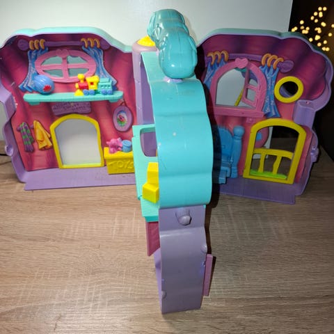 Paljon leikitty nukkekoti kalusteineen. Käytönjälkiä on, niistä kuvat. Muuten yleiskuva on ihan siisti. Nuo käytönjäljet on näppäräsormisen korjattavissa ja alaosan "pohjakerroksen" saa myös kokonaan irralleen yläosasta, jolloin nukketalon kunto on ihan jo hyvä. Vain nouto.