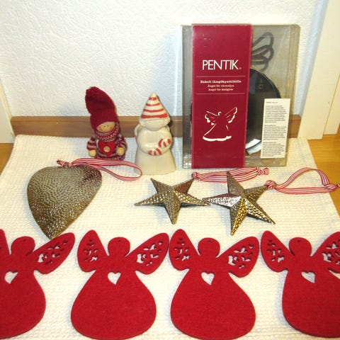 Pentikin 4 käyttämätöntä joulukoristetta, puumaista materiaalia. Tulitikkuaski kuvassa antamassa koko-osviittaa.