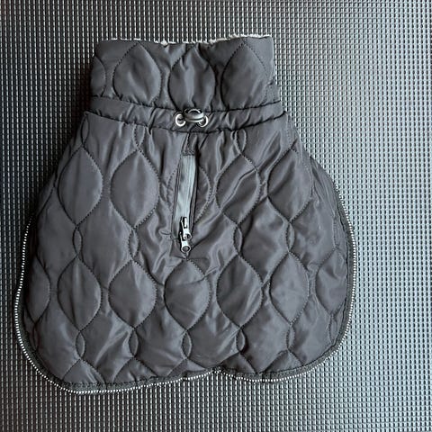 Myydään koiran toppaliivi, joissa valjaat samassa. Selän pituus 35 cm.