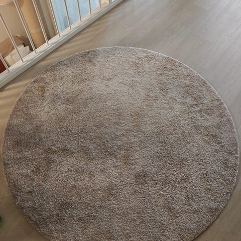 Annetaan muuton tieltä Ikea LOHALS pyöreä matto, halkaisija 230cm. Ostettu käytettynä, alkujaan tahra toisella puolella (kuva) ja nyt viime halloweenina maskeeraukset lensi matolle joten punaista väriä toisella puolella (tästäkin kuva). Osa langoista reunoista hieman repsottaa, mutta saa juuttilangalla halutessaan helposti korjattua.