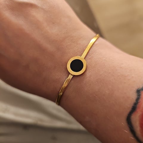 Kullanvärinen rannekoru. Ruostumatonta terästä. Myytävänä myös muualla.