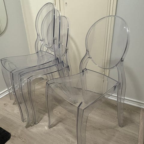 4 kpl hyväkuntoisia, kuvanmukaisia puutarha tai parveketuoleja. Tuolit ovat tukevan oloisia ja hyviä istua.