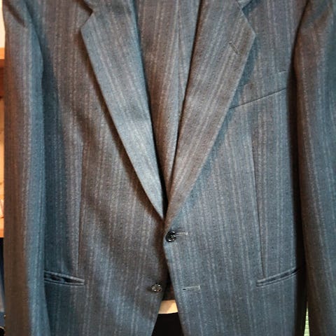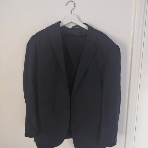 Siisti ja ehjä miesten pukutakki ja housut. Tumma kuosi jossa ohuita harmaita pystyraitoja. Takissa kaksirivi napitus ja vuori, kolme taskua ja sisäpuolella kolme povitaskua. Takin pituus 77 cm, hartia leveys 44 cm. Housujen pituus 97 cm, vyötärön ympärys 90 cm, vyölenkit. Materiaali: 55 % polyesteri, 45 % villa.