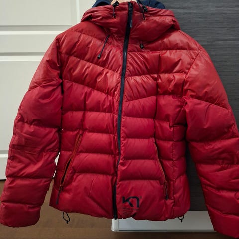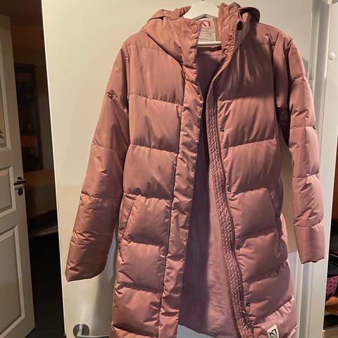 Taskun edessä kulumaa, kangas rikki n 2 cm matkalta. Paikoitellen hihan saumoissa kulumaa. On kuitenkin edelleen oikein muhkea ja lämmin untuvatakki!