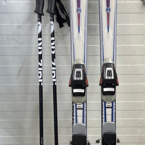 Laskettelusukset 110cm ja sauvat 85cm.