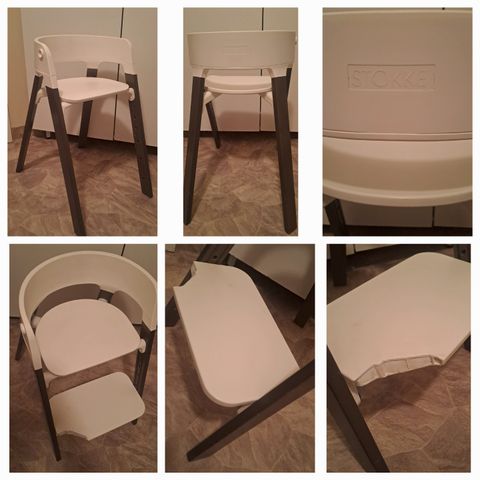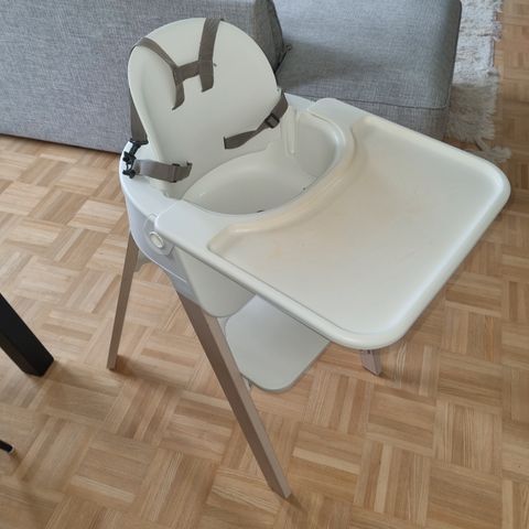 Myynnissä Stokke Steps -syöttötuoli, jossa valkoinen istuinosa ja puujalat.