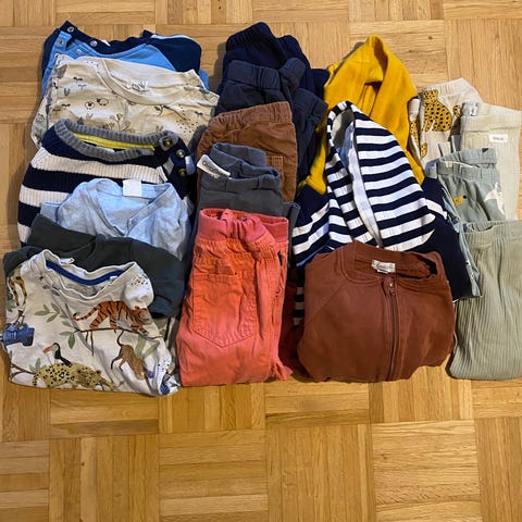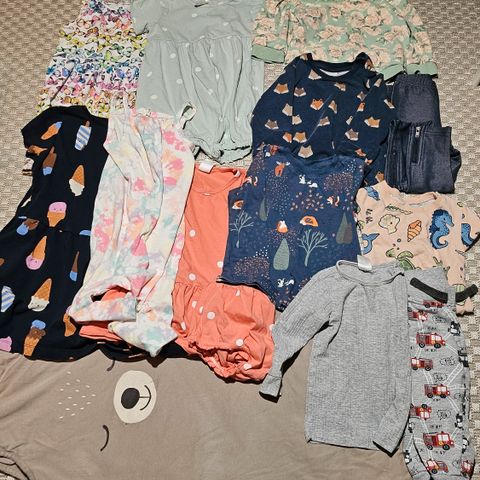 Myydään pakettina hyväkuntoisia vaatteita, kokoa 80/86. Merkkinä Name It, Mini Rodini, Gugguu, Newbie, Muumi, H&M… Miedosti hajustetulla pesty.