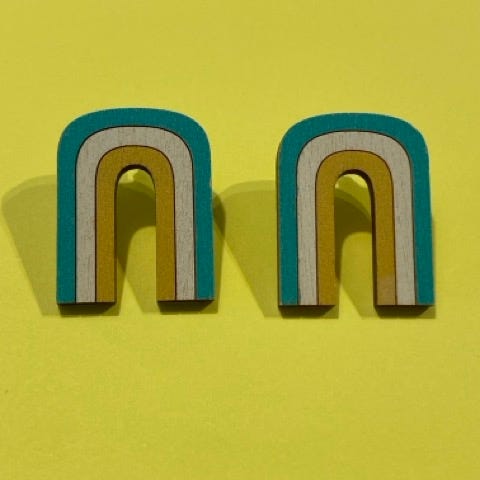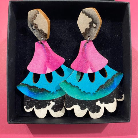 Korut ovat suomalaista koivuvaneria, metalliosat kirurginterästä. Kevyet korvissa. Olen säilyttänyt koruja korurasiassani suojassa pölyltä ja valolta. Koruissa on pieniä käytön jälkiä. Olen ympyröinyt kohdat tuotekuviin.